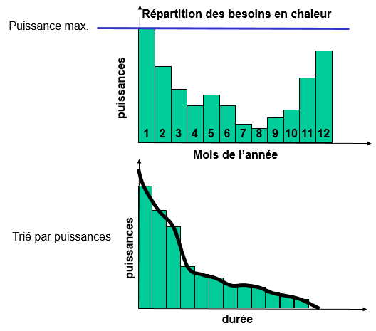 Pour le dimensionnement on va placer des détecteurs de consommation sur la production de chaleur et faire un graphique avec en ordonnée la puissance et en abscisse le nombre d’heure. C’est ce qu’on appelle la monotone des besoins en chaleurs.