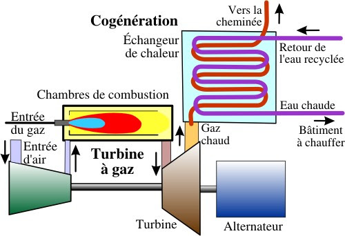 La cogénération via turbine à gaz consiste à produire simultanément de l’électricité et de la chaleur à partir d’une turbine alimentée généralement au gaz naturel, biogaz ou autres combustibles gazeux. La combustion se fait dans une chambre de combustion, les gaz chauds sous pression entraînent la turbine, qui actionne un alternateur pour produire de l’électricité.