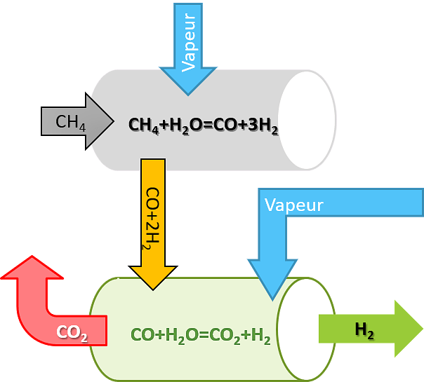 Le vaporeformage est le système le plus utilisé aujourd’hui pour la production d’hydrogène dans les industries chimiques et pétrochimiques, le rendement est compris entre 65 et 80%.