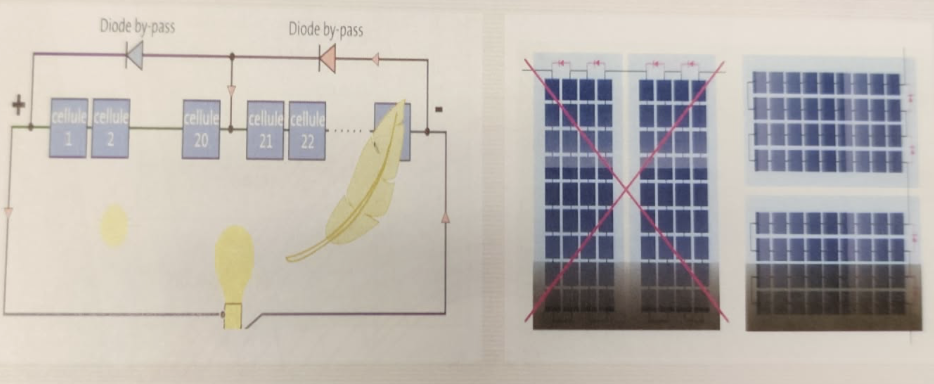 Il est très important de bien choisir l’emplacement du panneaux pour l’effet d’ombrage. Pour éviter les problèmes quand l’ombre va sur les panneaux on a des diodes by-pass.
