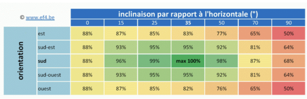 En Belgique la meilleure installation est orientation plein sud à 35°. En Belgique 1kWc -> 1050 kWh/an dans les conditions optimales.