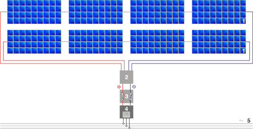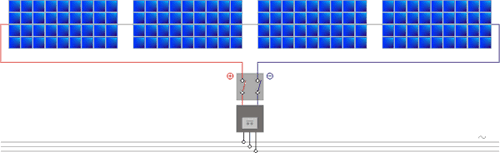 Dans cette configuration, l’onduleur ne perçoit pas les différences de caractéristiques entre les courants produits par les différents strings. Ils sont en effet couplés au préalable au niveau du boitier de raccordement. C’est à partir de ce courant (d’intensité égale à la somme des courants et de tension égale à la tension la plus haute des différents strings) réellement perçu par l’onduleur est que celui-ci adaptera ses caractéristiques d’entrées pour faire fonctionner le générateur photovoltaïque à son point de puissance maximum.