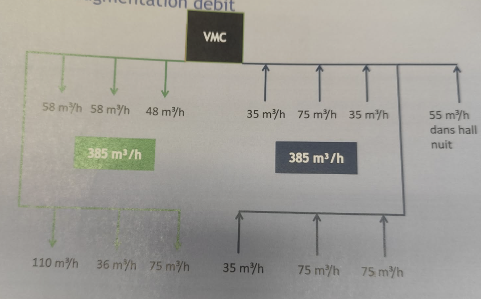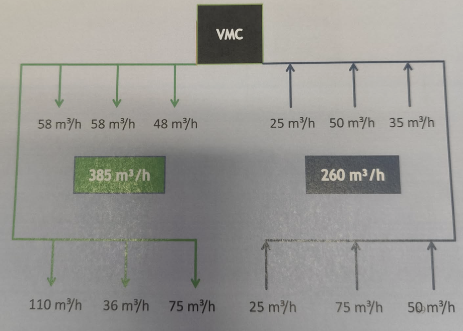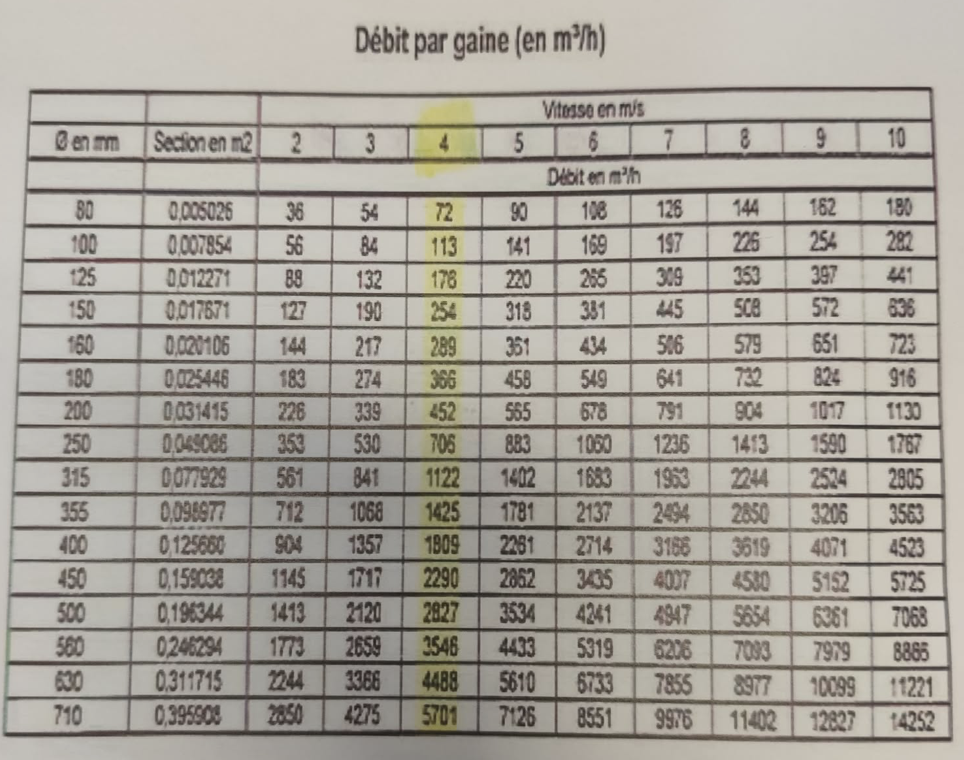 • exemple : WC de 1,5m x 1m = 1,5 m2 x 3,6 =1,452 m³ = 5,4 m3/h –> débit minimum = 25 m3/h