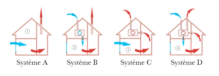 Il y a 3 grands systèmes de ventilation : A, B, C, D et E.