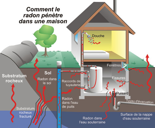 • gaz radioactif inodore, incolore, contenu dans les sols et les roches, ainsi que dans les matériaux de constructions